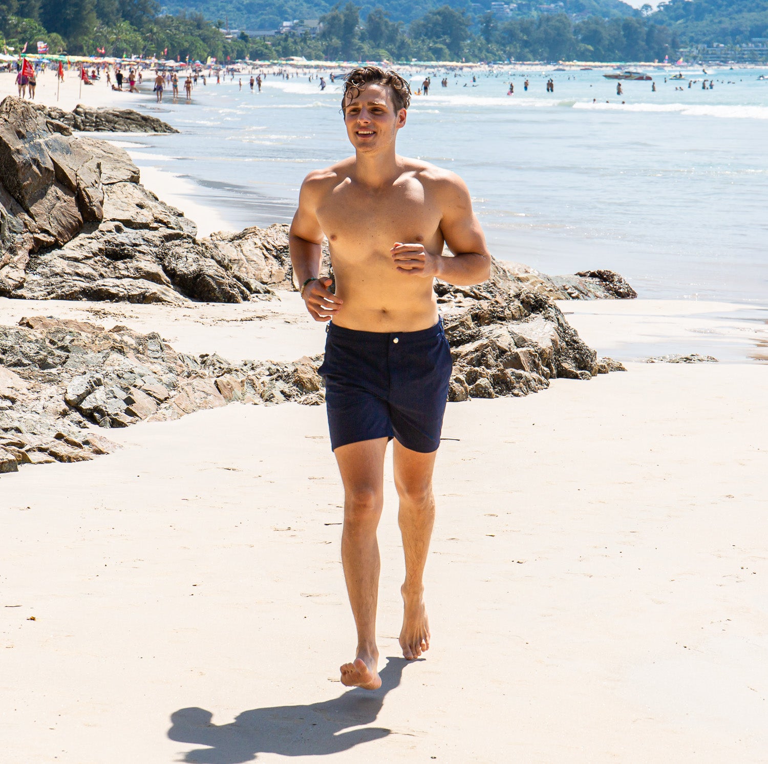 Our swim shorts are mid-length and true to size. Check the size chart below to find your perfect fit.